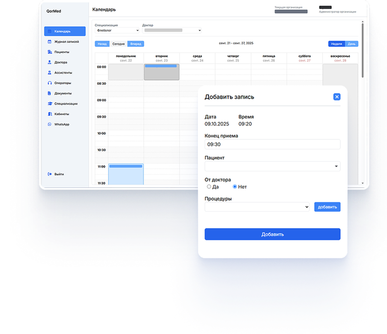 - QorMed объединяет все процессы клиники — от приема пациента до аналитики эффективности сотрудников.